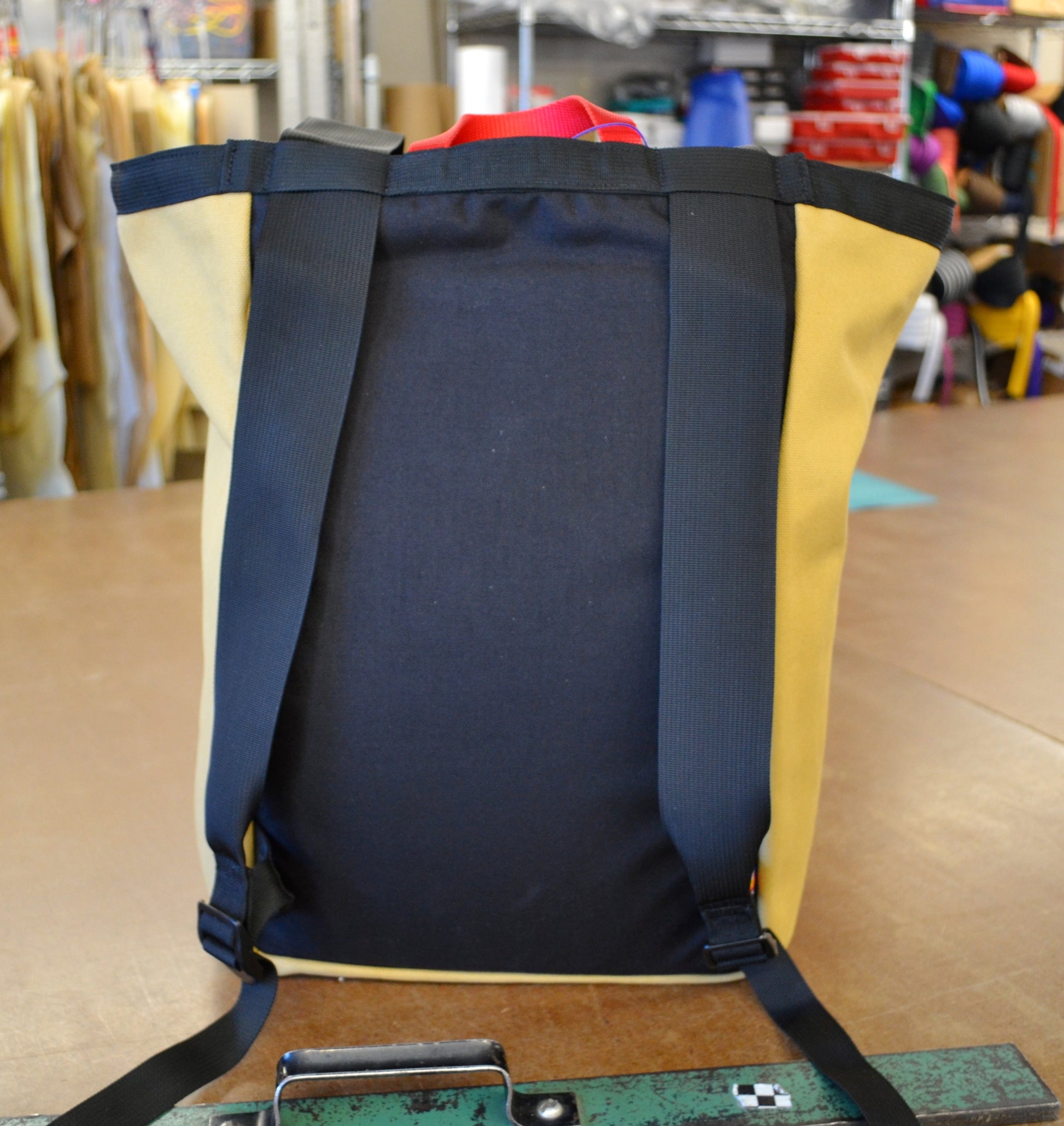 The Canvas Townie Pack is a do it all shopping and day bag. Made from 18oz cotton duck the adjustable shoulder straps close the bag when you put it on. Inside is a tablet sleeve and a zip security pocket. The back daisy is a convenient place to clip a phone bag or your keys. This is the most popular style bag we make. It is more of a big canvas bag than a pack, but you can put it on your back and ride home. It makes a great beach bag. Made in Colorado.