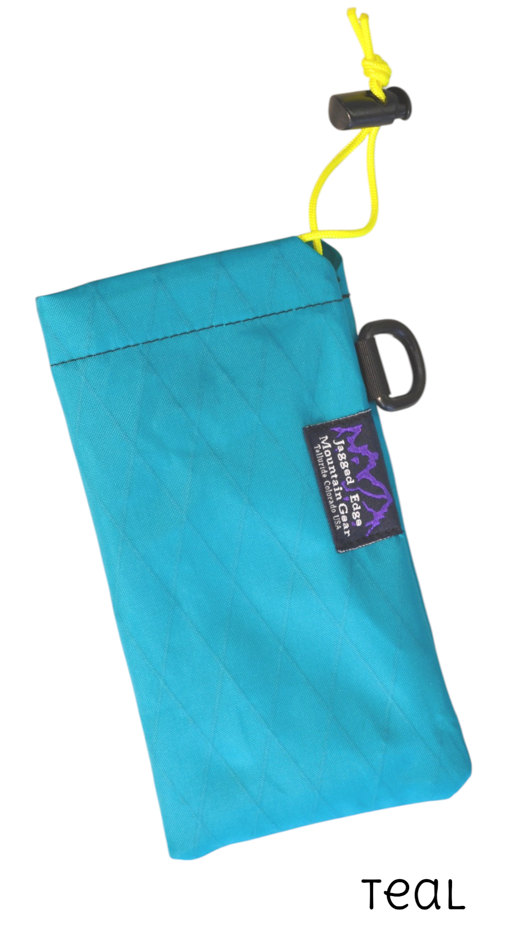 The Jagged Edge Glass Case is a great way to carry a glasses in a slip case. The X-PAC VX21 is durable and along with the laminated microfleece lining provides bump and scratch protection. The drawcord top closes enough to keep the glasses inside, and the D ring allows it to be clipped to its mates. Made in Colorado.